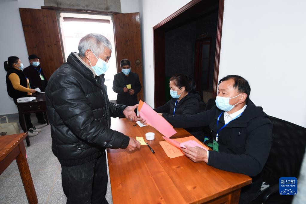 村民在浙江省杭州市臨安區湍口鎮迎豐村的基層投票點(diǎn)領(lǐng)取選票參加基層人大換屆選舉投票(2021年12月14日攝)。新華社記者 徐昱 攝