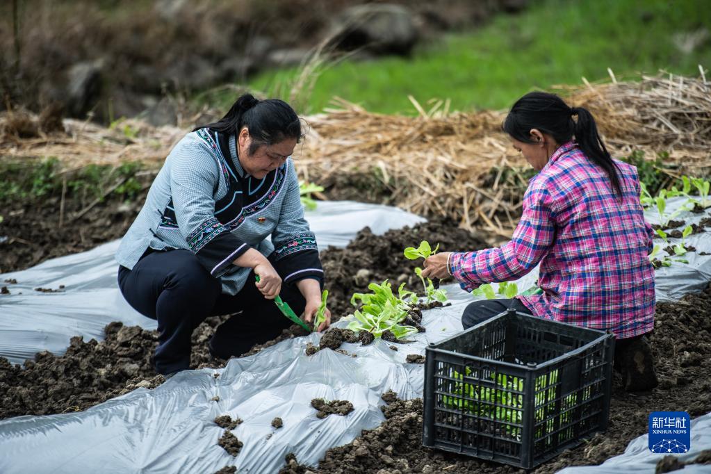 在貴州省羅甸縣沫陽(yáng)鎮麻懷村,鄧迎香(左)和村民一起種植白菜苗(2020年3月9日攝)。新華社記者 陶亮 攝