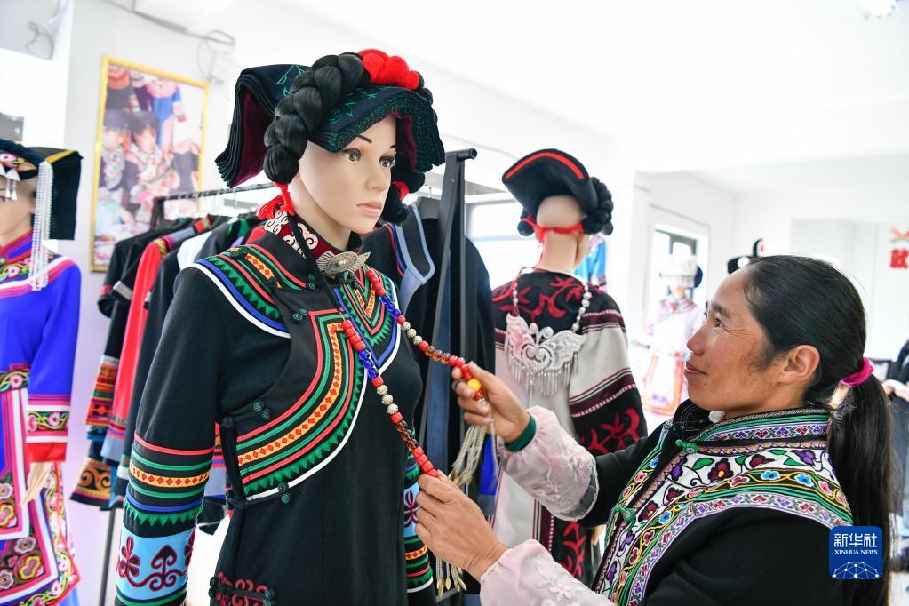 在貴州省畢節市威寧縣五里崗街道朝陽(yáng)新城易地扶貧搬遷安置小區,搬遷戶(hù)在就業(yè)扶貧手工車(chē)間整理縫制完畢的民族服飾(2021年11月28日攝)。新華社記者 楊文斌 攝
