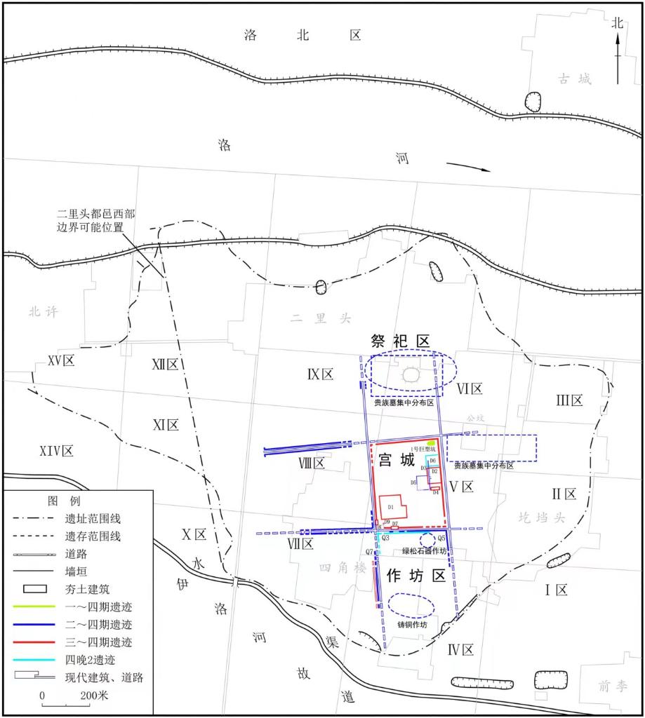 近年來(lái)進(jìn)行的考古工作逐步揭開(kāi)了二里頭遺址的多網(wǎng)格式布局。在此基礎上,2021年以來(lái),考古工作者陸續揭露了多處城市道路和道路兩側夯土墻,包括宮城北側道路上的門(mén)道、宮城西部圍墻,并發(fā)現宮城西側道路夯土墻向北延伸200余米,據此推測已知作坊區、宮殿區、祭祀區以西至少各存在一個(gè)分區。