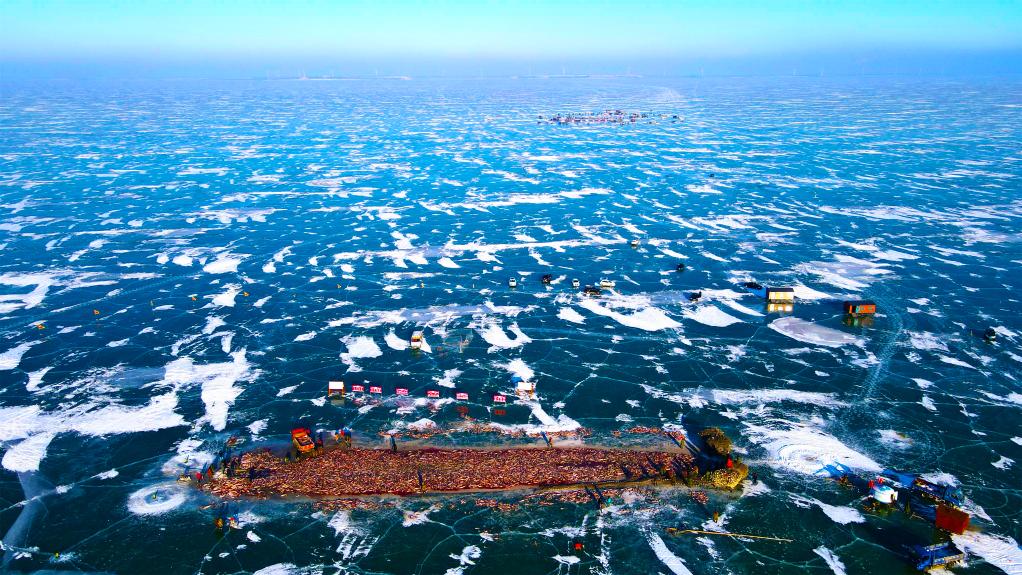 這是2021年12月29日無(wú)人機拍攝的查干湖冬捕畫(huà)面。(畢重明 攝)