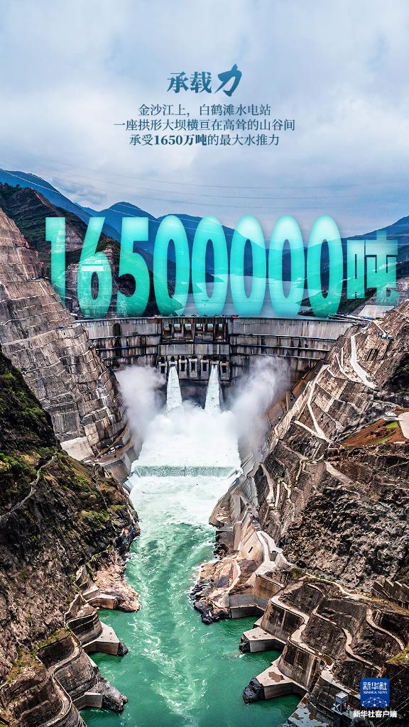 金沙江上,白鶴灘水電站,一座拱形大壩橫亙在高聳的山谷間,承受1650萬(wàn)噸的最大水推力。