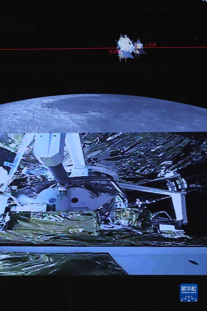 這是在北京航天飛行控制中心指揮大廳拍攝的嫦娥五號上升器與軌道器返回器組合體交會(huì )對接畫(huà)面(2020年12月6日攝)。新華社記者 金立旺 攝