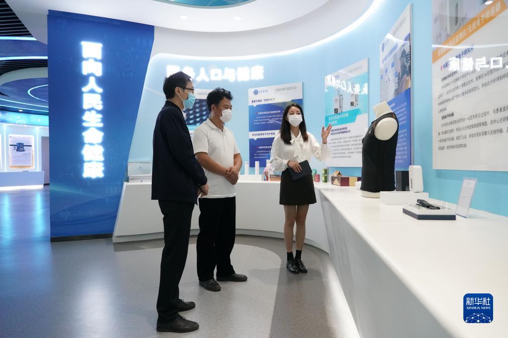 在中科智匯工場(chǎng),工作人員(右一)在中國科學(xué)院科技成果廳向參觀(guān)者介紹展品( 9月22日攝)。新華社記者 任超 攝