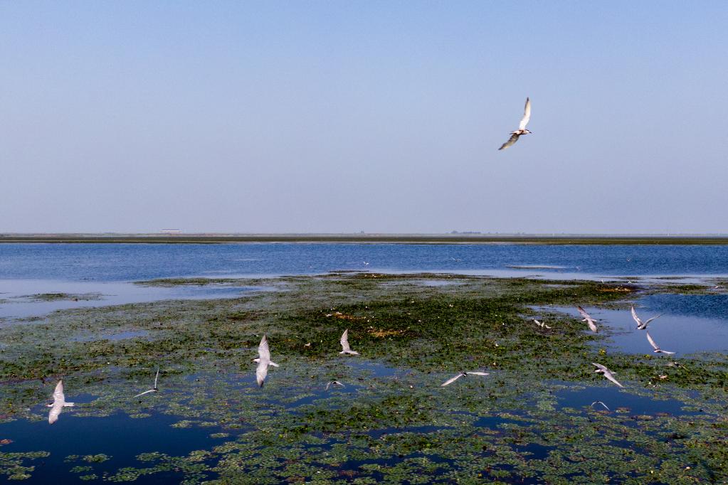 候鳥(niǎo)在湖北省武漢市沉湖生態(tài)自然保護區水面上飛翔。新華社記者 伍志尊 攝