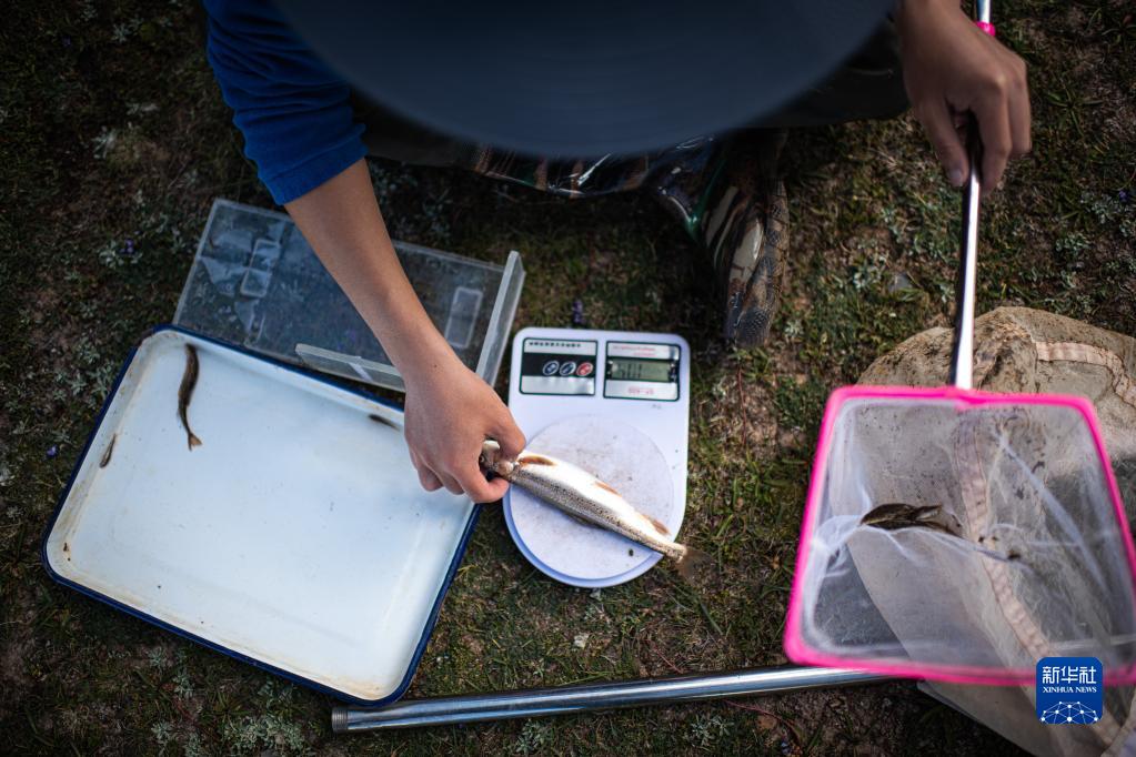 長(cháng)江科學(xué)院科考隊員劉晗在長(cháng)江南源當曲對采集的一尾小頭裸裂尻魚(yú)稱(chēng)重(2022年7月25日攝)。 新華社記者 肖藝九 攝