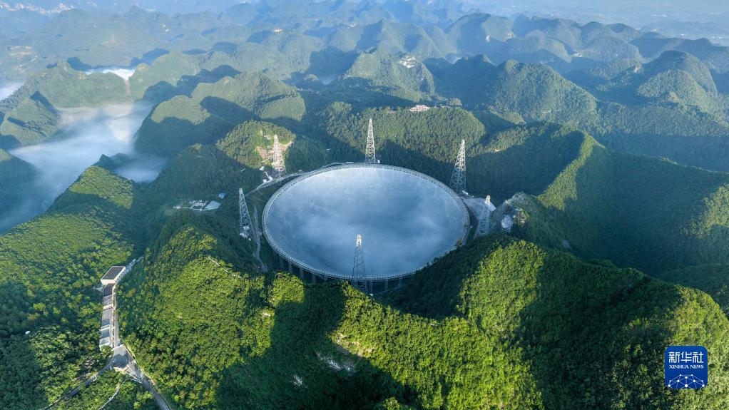 晨曦中的“中國天眼”全景(無(wú)人機照片,2022年7月25日維護保養期間拍攝)。新華社記者 歐東衢 攝