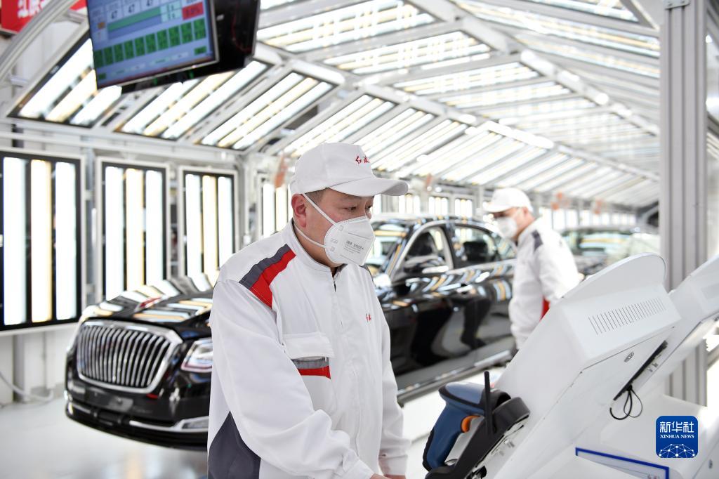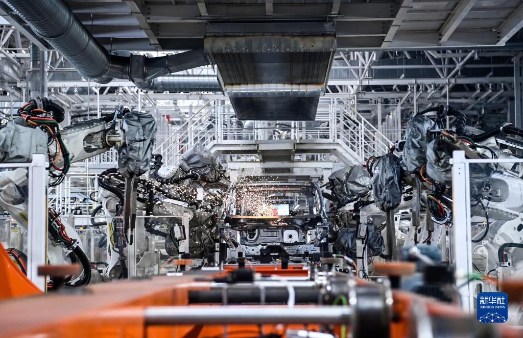 2022年10月17日,在吉林長(cháng)春中國第一汽車(chē)集團有限公司紅旗繁榮工廠(chǎng)焊裝車(chē)間內,焊裝機器人在生產(chǎn)線(xiàn)上焊接車(chē)身。新華社記者 顏麟蘊 攝