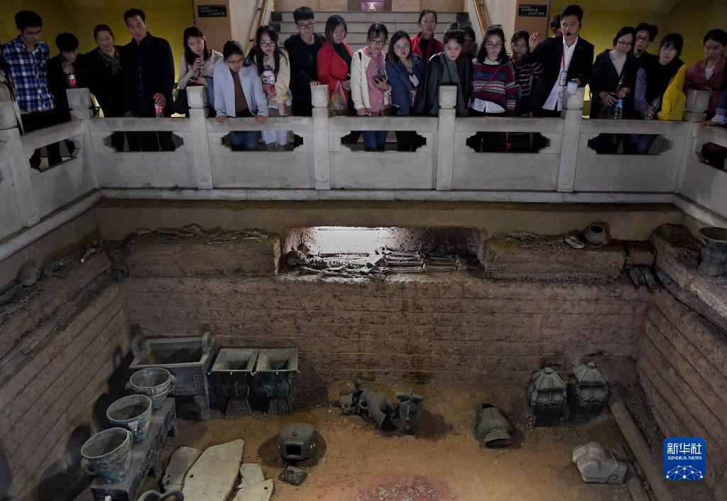 游客在河南安陽(yáng)殷墟宮殿宗廟遺址內的婦好墓參觀(guān)(2018年10月12日攝)。 新華社記者 李安 攝