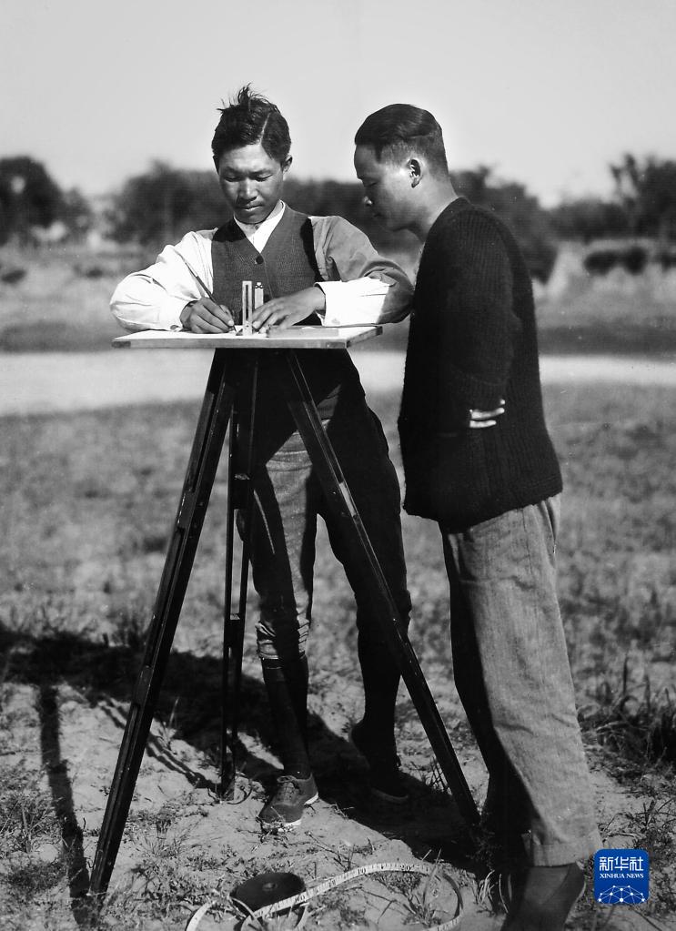 董作賓(右)和李春昱在殷墟第一次發(fā)掘中測量繪圖(資料照片)。 新華社發(fā)