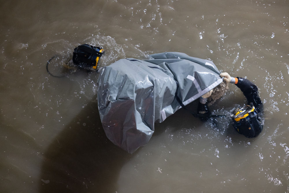 11月21日,工作人員下水給桅桿“穿上”保護衣。