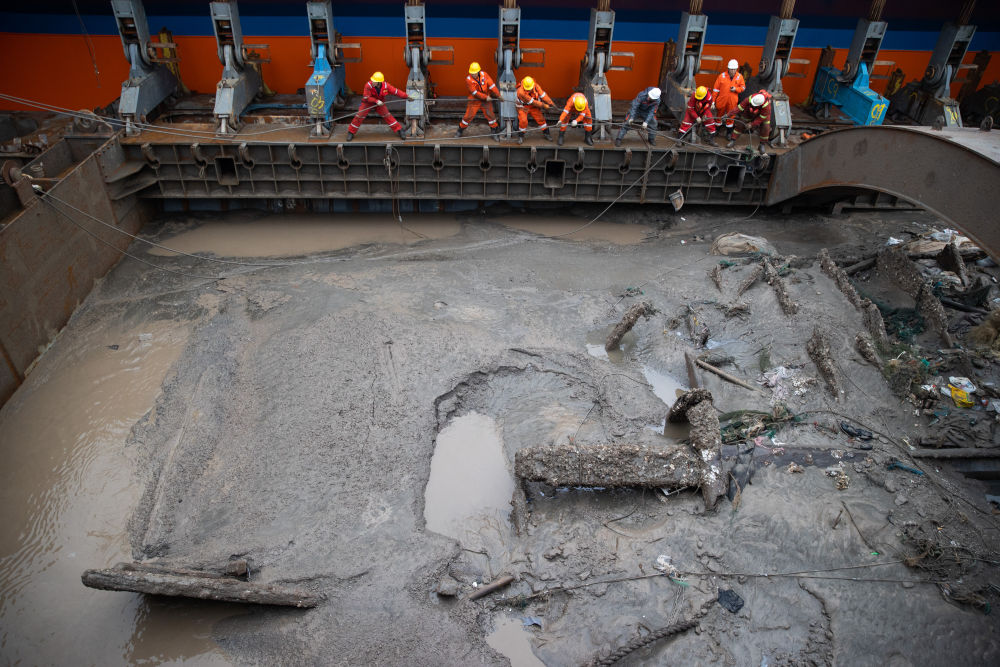 凌晨時(shí)分只有桅桿出水,到清晨時(shí)更多船體出水。古船的纜繩、艙體等裹著(zhù)厚厚的淤泥,傳遞著(zhù)這艘船的百年滄桑。