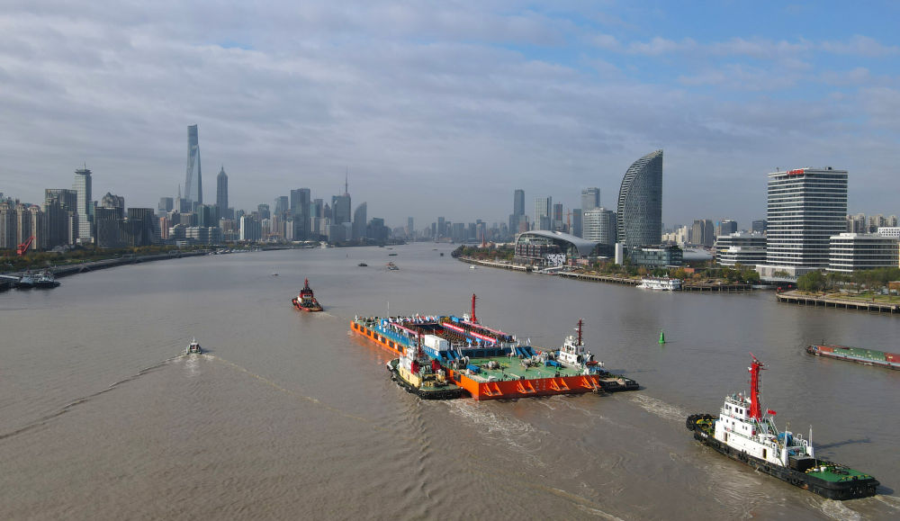11月25日,裝載著(zhù)長(cháng)江口二號古船的“奮力”輪航行在黃浦江楊浦濱江水域。