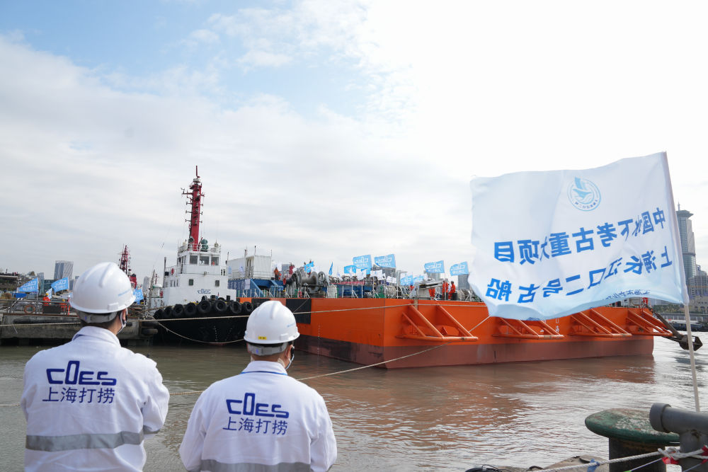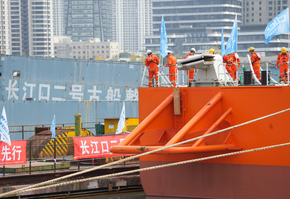 11月25日,“奮力”輪裝載著(zhù)長(cháng)江口二號古船??可虾4瑥S(chǎng)舊址1號船塢,準備進(jìn)塢。