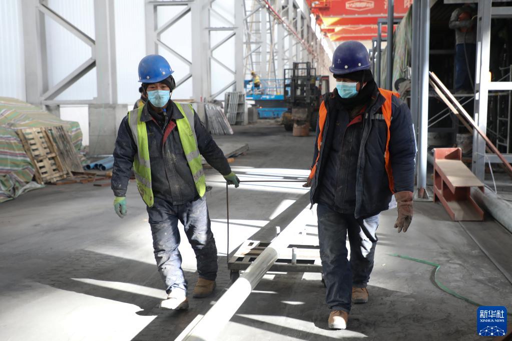 2022年12月12日,在位于蘭州新區的蘭州宏彬新能源發(fā)展有限公司,工人在搬運建材,抓緊施工。新華社記者 馬希平 攝