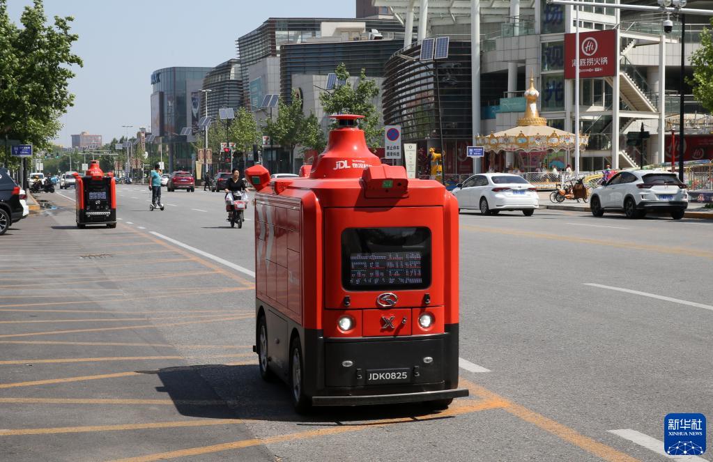 2021年5月18日,一輛自動(dòng)行駛快遞車(chē)在天津(西青)國家級車(chē)聯(lián)網(wǎng)先導區內運送貨物。新華社發(fā)