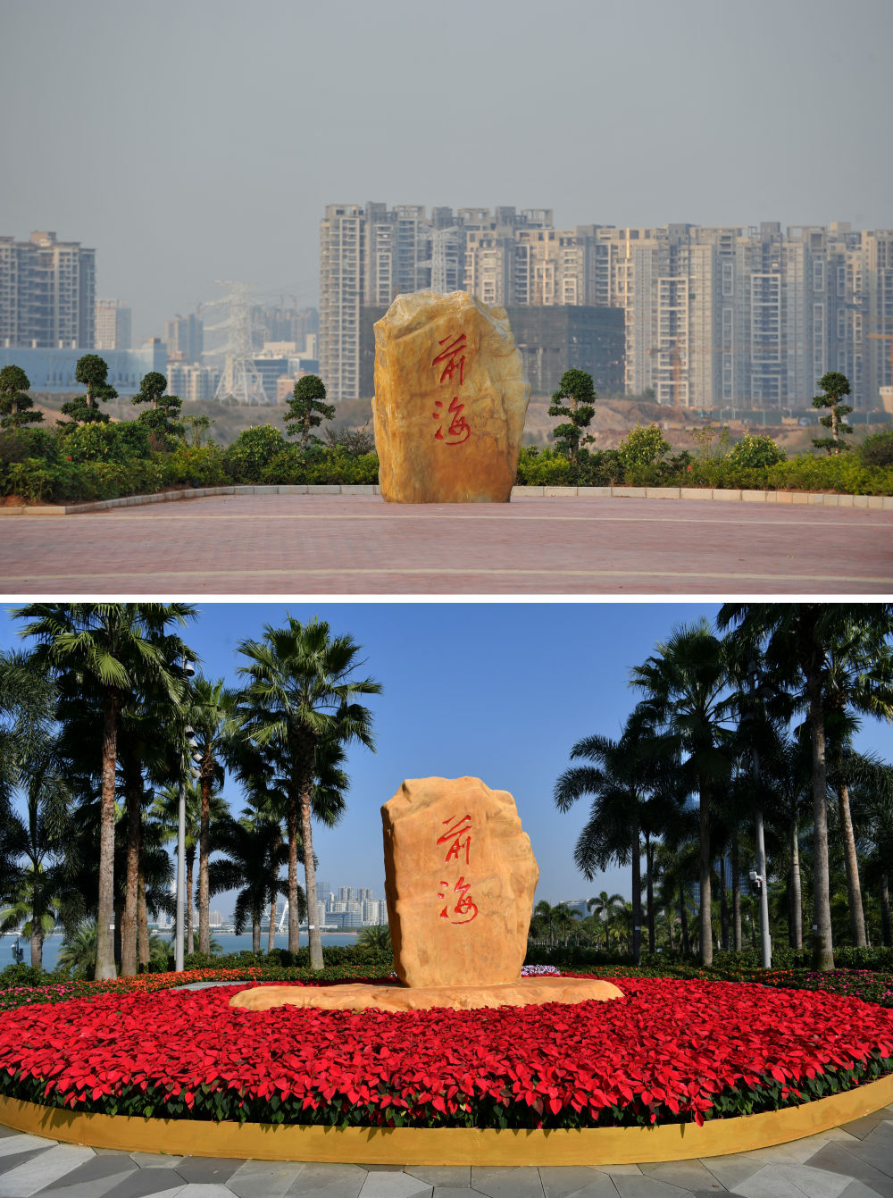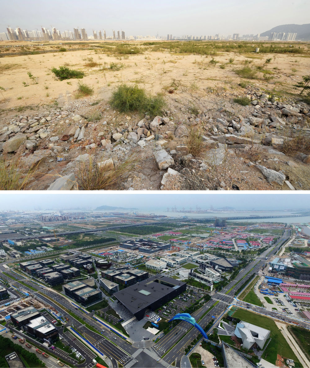 ↑ 拼版照片上圖:2012年10月22日拍攝的深圳前海;下圖:2016年4月19日航拍深圳前海。