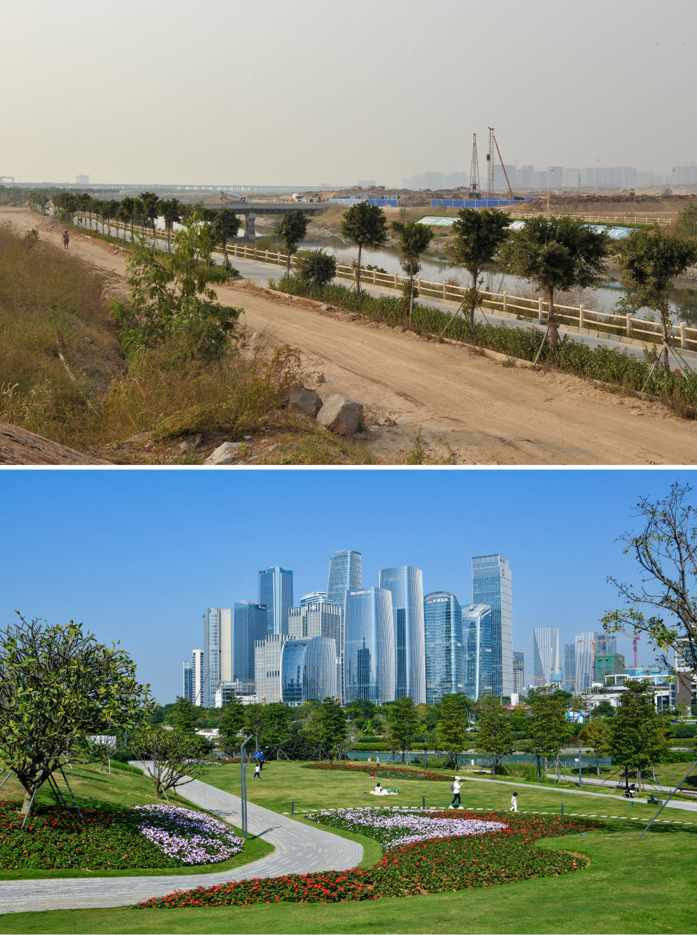 ↑拼版照片上圖:2012年10月22日拍攝的前海,河道兩旁一片荒蕪;下圖:2022年12月8日拍攝的前海,河道兩旁已變成鳥(niǎo)語(yǔ)花香的公園。