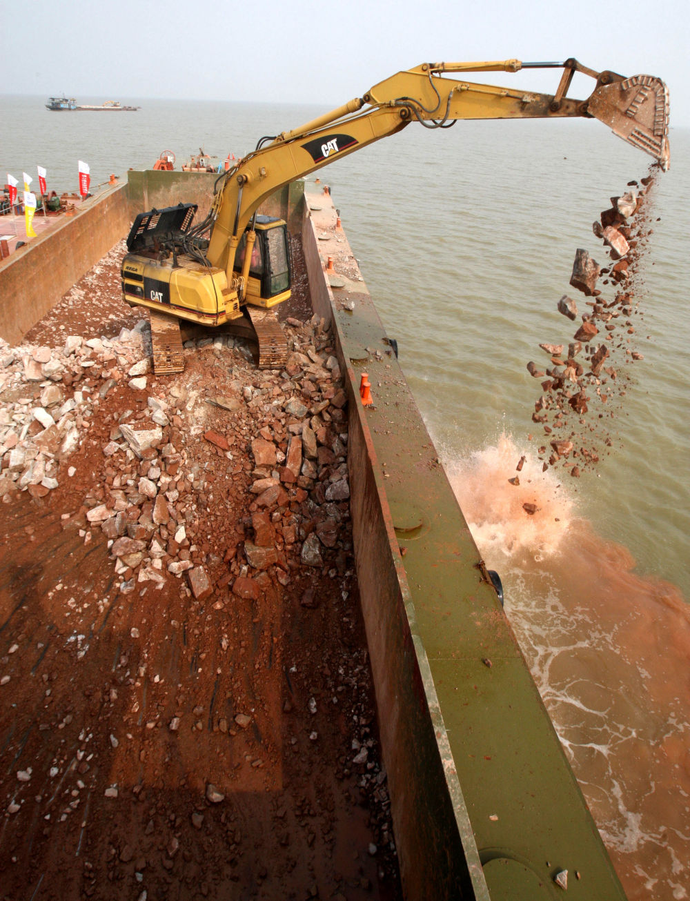 ↑ 2010年8月6日,在鄰近珠海九洲港的海面上,施工人員在施工船上拋石填海,建設港珠澳大橋珠澳口岸人工島。(資料照片)