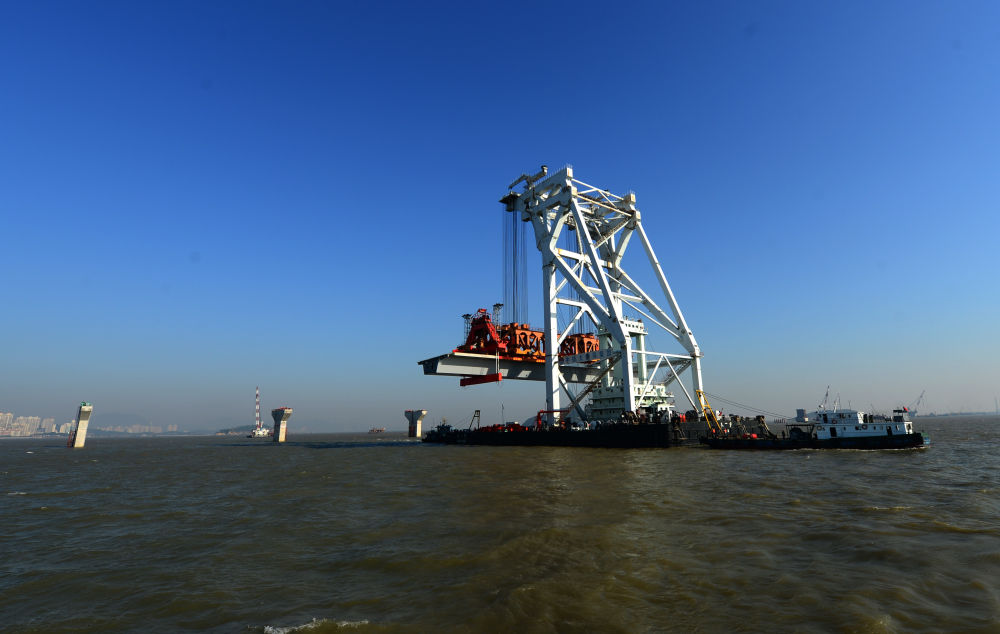 ↑ 2013年12月2日,港珠澳大橋首片組合梁在架設安裝。當天,港珠澳大橋首片組合梁被成功架設安裝在位于伶仃洋中的橋墩上。首片組合梁的成功架設標志著(zhù)港珠澳大橋施工實(shí)現了由下部結構施工向上部結構施工的轉化。新華社記者程敏攝
