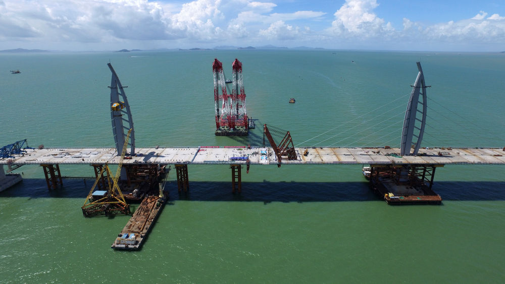 ↑ 2015年9月6日,正在海上鋪設鋼箱梁橋面的港珠澳大橋。當日10時(shí)許,在海上撐起港珠澳大橋的全部墩臺均告完工。這標志著(zhù)這座連接香港大嶼山、澳門(mén)半島和廣東省珠海市的跨海大橋,已全面轉入鋼箱梁吊裝的施工工序。該橋建設進(jìn)入了工程沖刺階段。新華社記者魏蒙攝