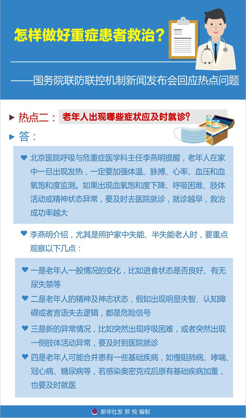 老年人出現哪些癥狀應及時(shí)就診?怎樣做好老年和兒童重癥患者的救治?圍繞公眾關(guān)注的熱點(diǎn)問(wèn)題,國務(wù)院聯(lián)防聯(lián)控機制組織專(zhuān)家作出解答。