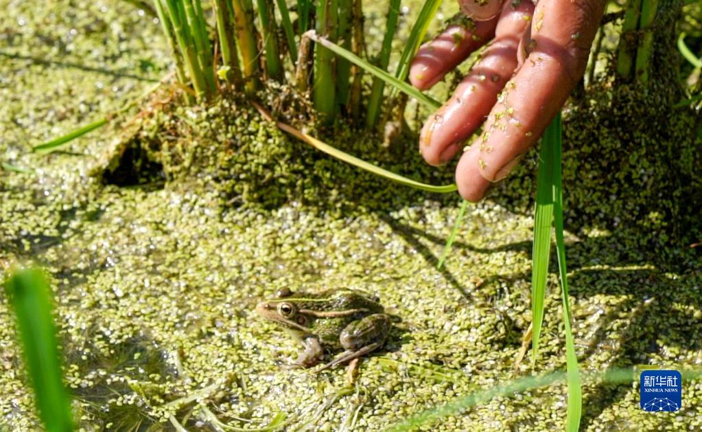 這是吉林省白城市鎮賚縣慶江種養殖農民專(zhuān)業(yè)合作社有機稻田中的青蛙(2022年7月12日攝)。新華社記者 王帆 攝