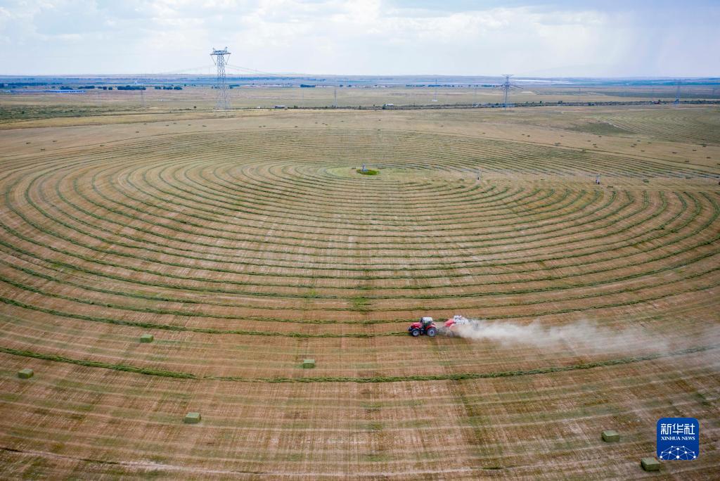 在寧夏鹽池縣馮記溝鄉平臺村的優(yōu)質(zhì)牧草基地,農戶(hù)用機械將牧草打捆(無(wú)人機照片,2021年7月14日攝)。新華社記者 楊植森 攝