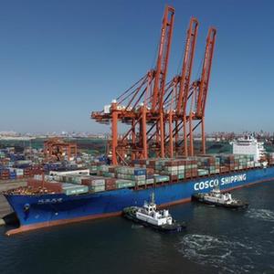 一艘輪船在拖輪的協(xié)助下向唐山港京唐港區集裝箱碼頭靠泊(2021年10月23日攝,無(wú)人機照片)。新華社記者 朱旭東 攝