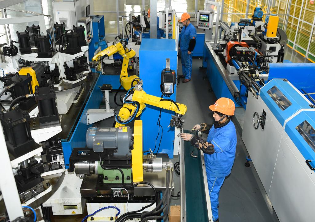 2月14日,浙江省湖州市吳興區的一家企業(yè),工作人員和智能機器人協(xié)作生產(chǎn)不銹鋼管件。新華社記者 翁忻旸 攝