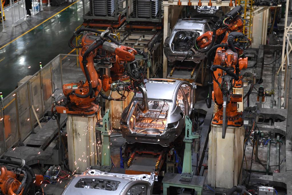 工業(yè)機器人在江淮汽車(chē)乘用車(chē)焊接車(chē)間生產(chǎn)線(xiàn)上工作(2月22日攝)。新華社記者 劉軍喜 攝