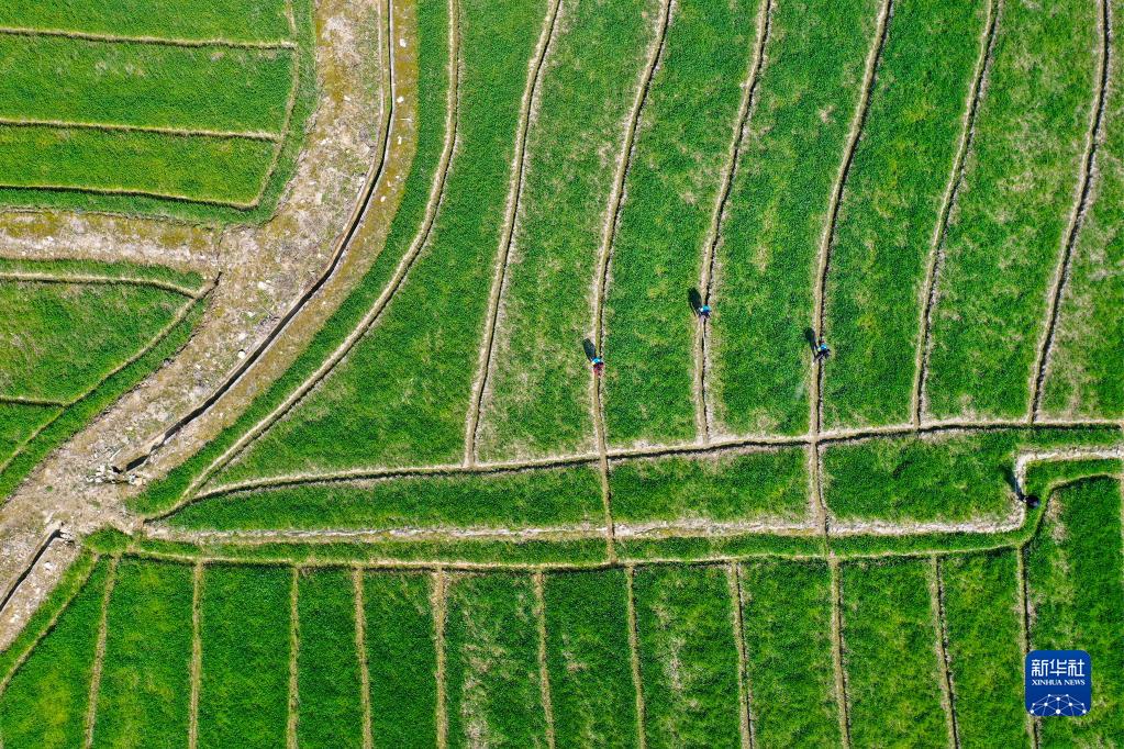 3月9日,浙江省寧波市鄞州區東吳鎮天童村村民在田間管護農作物(無(wú)人機照片)。新華社發(fā)(胡學(xué)軍 攝)