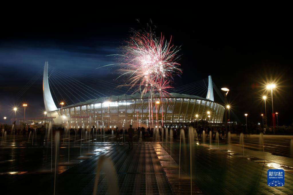 焰火在柬埔寨金邊的柬埔寨國家體育場(chǎng)上空燃放(2021年12月18日攝)。當日,由中國政府援建、中國建筑股份有限公司承建的柬埔寨國家體育場(chǎng)項目正式啟用。新華社發(fā)(索萬(wàn)納拉攝)