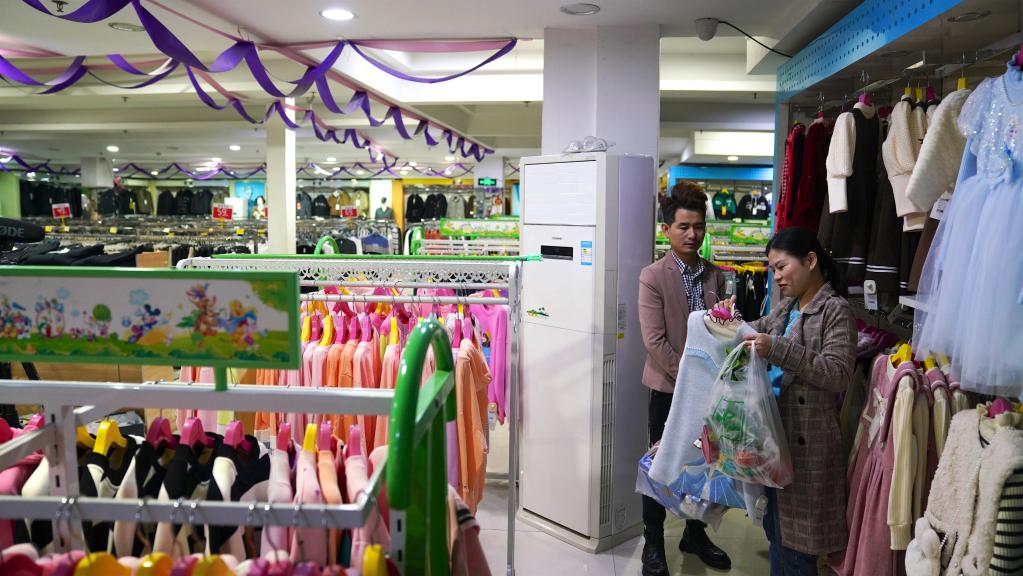 2023年1月2日,付梅嬌和丈夫鄒輝一起在廣東省汕頭市潮陽(yáng)區的商場(chǎng)為孩子選購裙子。 新華社記者 胡晨歡攝