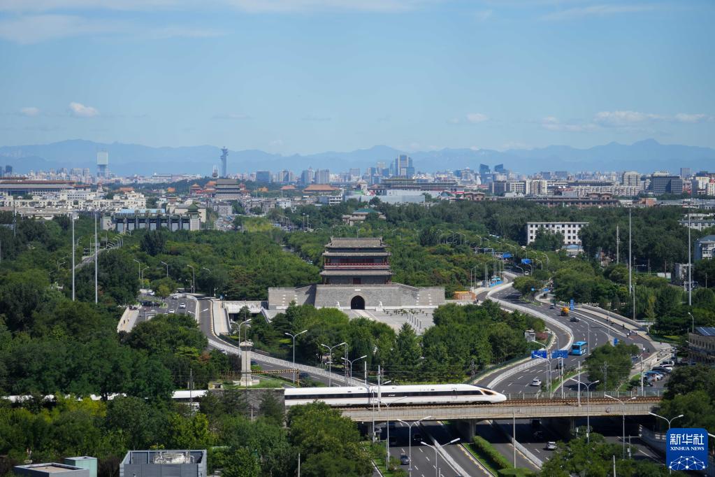 一列復興號列車(chē)從北京永定門(mén)城樓前駛過(guò)(2022年8月16日攝)。新華社記者 鞠煥宗 攝
