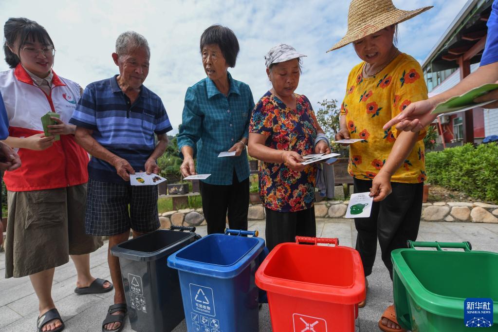 浙江省杭州市臨安區龍崗鎮的村民們參加垃圾分類(lèi)小游戲,學(xué)習垃圾分類(lèi)知識(2021年9月16日攝)。新華社記者 徐昱 攝