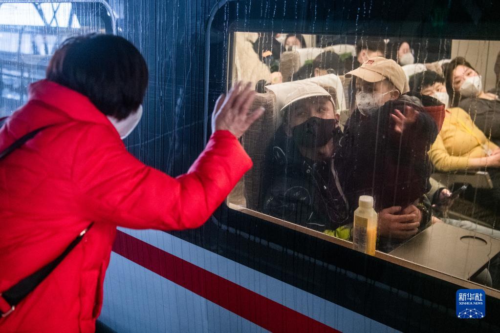 2023年1月7日,在武漢站站臺,旅客與親人告別。當日,2023年春運啟動(dòng)。新華社記者 伍志尊 攝