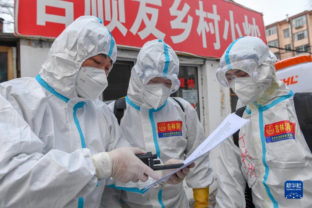 2022年3月18日,吉林省吉林市消防救援支隊黨員先鋒突擊隊隊員在進(jìn)行社區消殺工作安排。新華社記者 張楠 攝