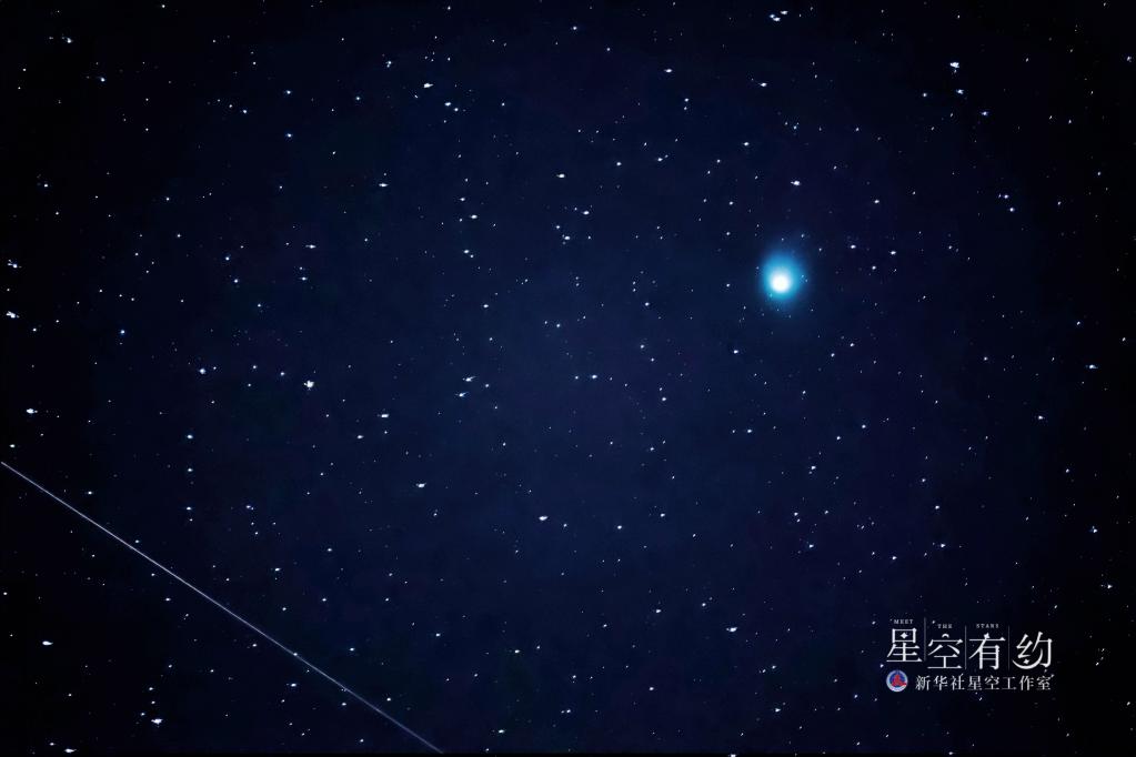 北京市天文愛(ài)好者王俊峰2023年1月26日在遼寧東戴河拍攝的流星劃過(guò)彗星C/2022 E3。(本人供圖)