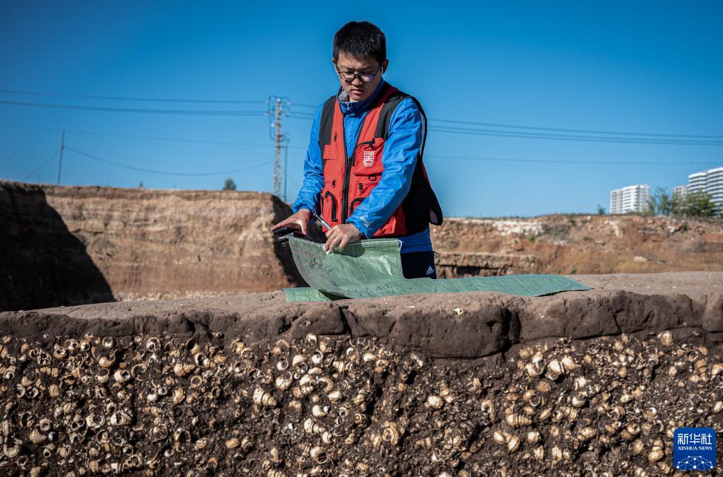 古城村遺址考古領(lǐng)隊、云南省文物考古研究所副研究館員周然朝介紹,古城村遺址是一處商周時(shí)期的大型湖濱貝丘遺址,面積約4.2萬(wàn)平方米,現存的貝丘堆積最厚處達6.5米,由大量尾部被敲破的螺螄殼與灰土層交替堆疊形成。記者在考古發(fā)掘現場(chǎng)看到,螺螄殼面積之廣、堆積之厚、數量之多,蔚為壯觀(guān)。