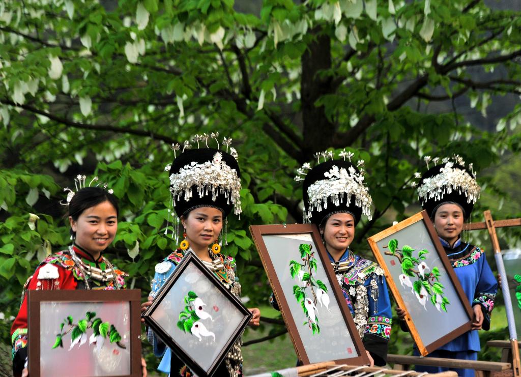 繡娘展示“鴿子花”系列苗繡產(chǎn)品。新華社發(fā)(龍元彬攝)