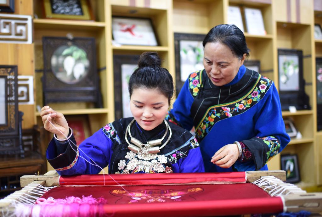 石麗平(右)在指導繡娘。新華社發(fā)(龍元彬攝)