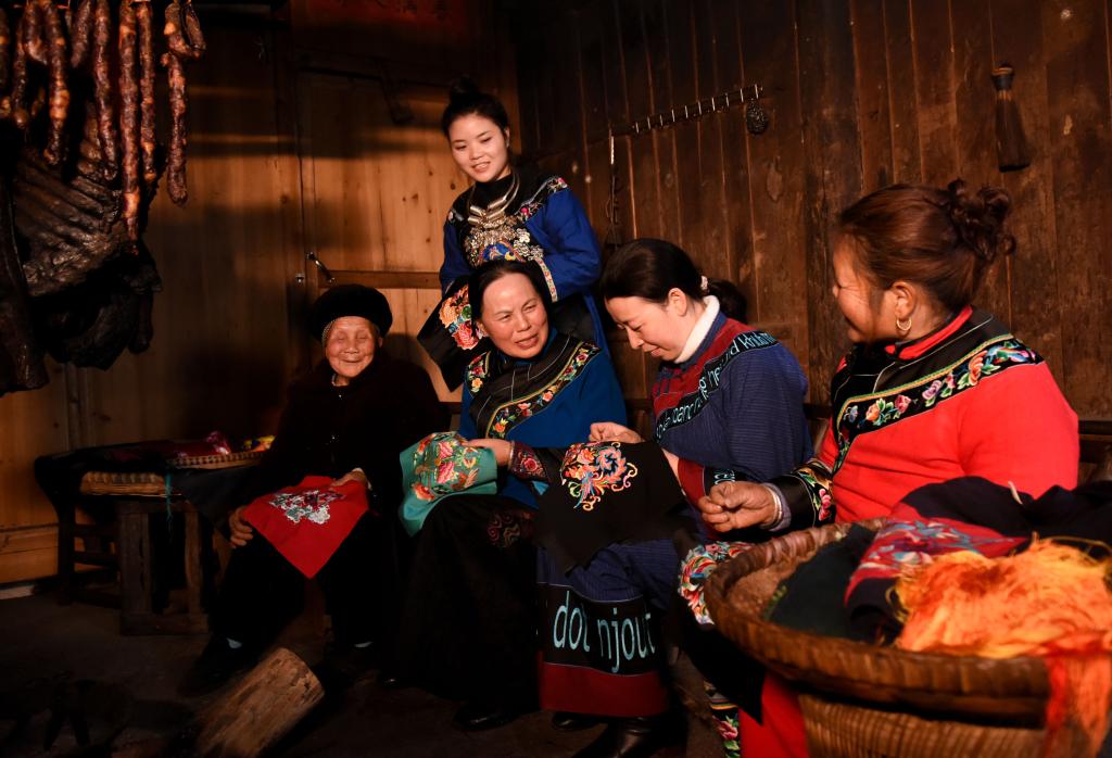 石麗平(右三)和繡娘們切磋交流苗繡技藝。新華社發(fā)(龍元彬攝)