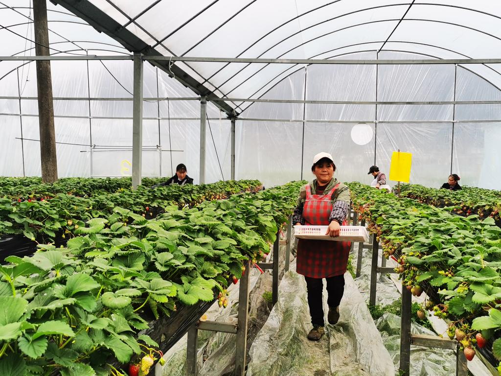 2月8日,工人在泗渡農場(chǎng)大棚里采摘草莓。新華社記者 鄭明鴻 攝