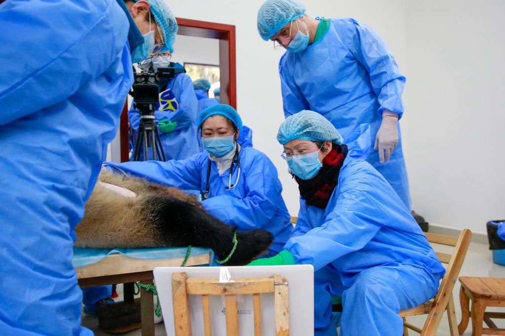 侯蓉(右下)為大熊貓檢查身體(資料照片)。新華社發(fā)(成都大熊貓繁育研究基地供圖)