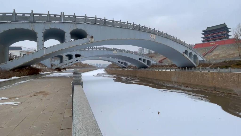 春寒料峭中,一場(chǎng)降雪過(guò)后,甘肅省白銀市會(huì )寧縣銀裝素裹,穿城而過(guò)的祖厲河大部分河面被冰雪覆蓋,少量河水淙淙向北,朝著(zhù)下游的黃河蜿蜒而去。