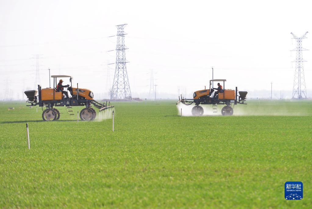河北省晉州市槐樹(shù)鎮北白水村一家農業(yè)合作社的社員操作農業(yè)機械給冬小麥噴灑農藥(2023年3月14日攝)。新華社記者 楊世堯 攝