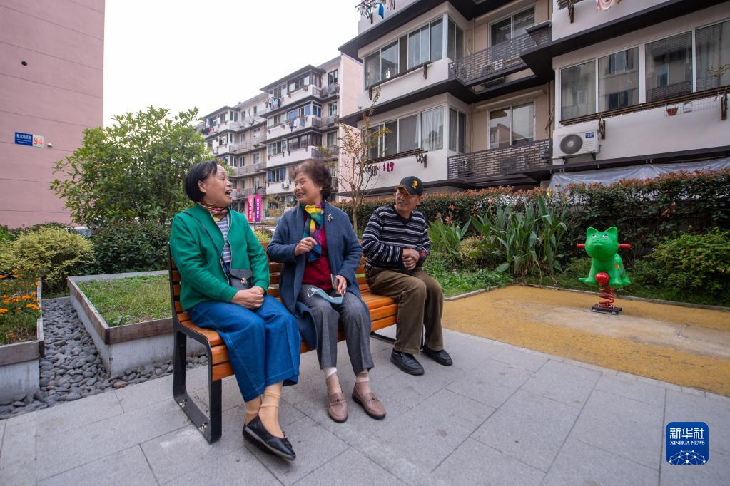 浙江省杭州市西湖區北山街道松木場(chǎng)社區的居民在老舊小區改造后建成的休閑場(chǎng)地聊家常(2022年11月1日攝)。新華社記者 江漢 攝