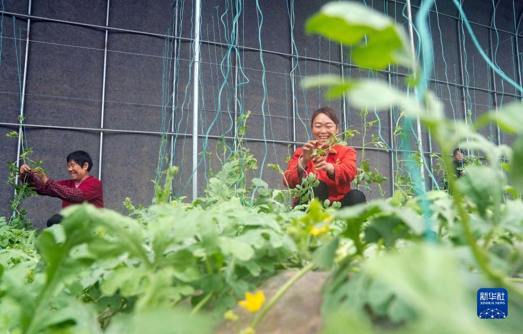 農戶(hù)在河北滄州渤海新區黃驊市一處農業(yè)科技示范園為西瓜秧整枝(2023年2月11日攝)。新華社記者 駱學(xué)峰 攝