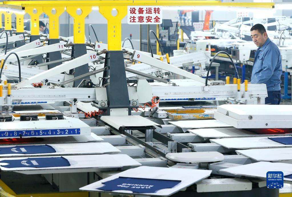 山東省青島市即墨區青島華信印花有限公司的工人在智能印花生產(chǎn)線(xiàn)上生產(chǎn)出口產(chǎn)品(2023年3月14日攝)。新華社發(fā)(梁孝鵬 攝)